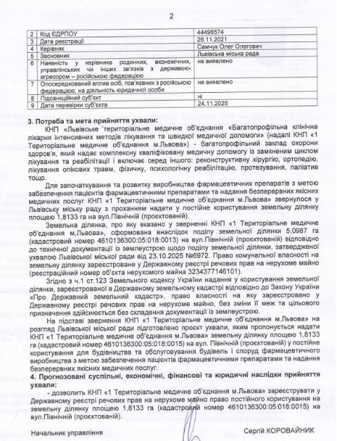 "Надати КНП "Львівське ТМО "Багатопрофільна клінічна лікарня інтенсивних методів лікування та швидкої медичної допомоги" земельну ділянку площею 1,8133 га на вул. Північній (проєктованій) у постійне користування для будівництва та обслуговування будівель і споруд фармацевтичного виробництва з метою забезпечення пацієнтів фармацевтичними препаратами та надання безперервних якісних медичних послуг за рахунок земель промисловості, транспорту, електронних комунікацій, енергетики, оборони та іншого призначення" – йдеться в ухвалі.