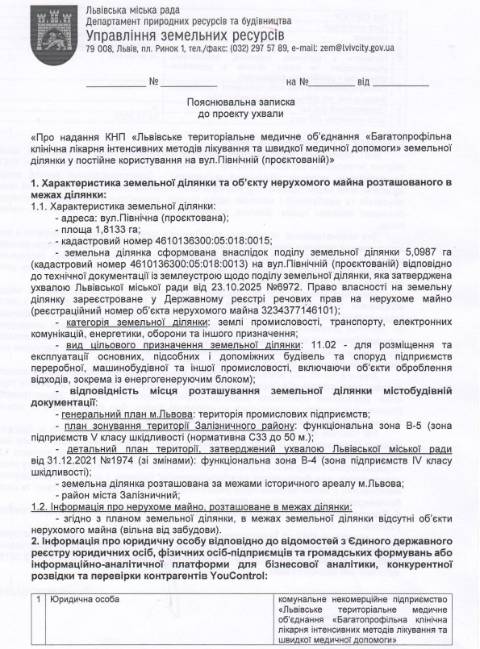 Львівська міськрада оприлюднила проєкт ухвали про надання КНП "Львівське ТМО "Багатопрофільна клінічна лікарня інтенсивних методів лікування та швидкої медичної допомоги" (ТМО №1) земельної ділянки у постійне користування на вул. Північній (проєктованій).