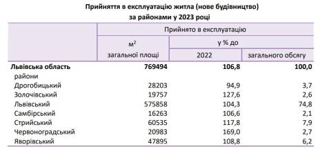 Зросли обсяги прийняття житла, у порівнянні з 2022 роком, у всіх районах області, з них найбільше у Червоноградському (у 1,7 раза), Золочівському (у 1,3 раза) та Стрийському (у 1,2 раза) районах.