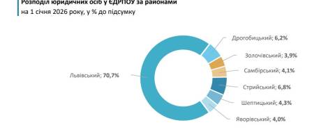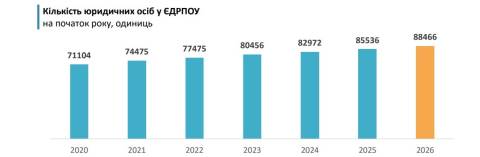 Станом на 1 січня цього року на території Львівської області зареєстрували 88,5 тисячі юридичних осіб. Порівняно з 2025 роком, їхня кількість зросла на 2,9 тисячі або на 3,4%.