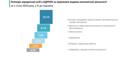 Торік найбільше юридичних осіб зареєстрували в гуртовій та роздрібній торгівлі, ремонті автотранспортних засобів та мотоциклів (14,3 тисячі або 16,1% від загальної кількості юридичних осіб).