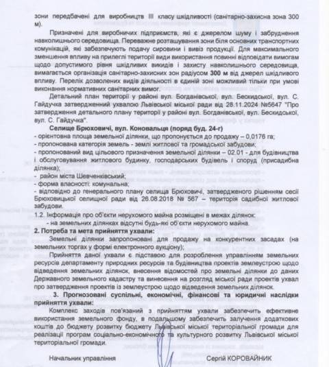 Згідно з документом, на продаж у приватну власність планують виставити дві ділянки у Львові та одну у селищі Брюховичі, які передбачені під освіту, промисловість та житлову забудову. Зокрема:
