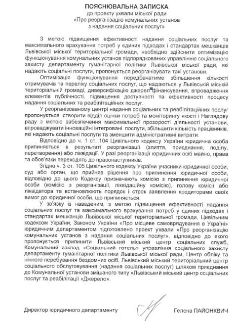 На сайті Львівської міськради управління культури підготувало та оприлюднило проєкт ухвали "Про реорганізацію комунальних установ з надання соціальних послуг", якою планують ліквідувати Львівський міський центр соціальних служб, комунальний заклад "Соціальний готель", Центр обліку та нічного перебування бездомних осіб та Львівський міський територіальний центр соціального обслуговування, приєднавши їх до центру реабілітації "Джерело".