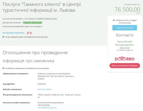 Львівське комунальне некомерційне підприємство "Центр розвитку туризму м. Львова" оголосило тендер у системі ProZorro на послуги "Таємного клієнта" в Центрі туристичної інформації Львова, які переможець тендеру має постачати до 31 січня 2020 року.