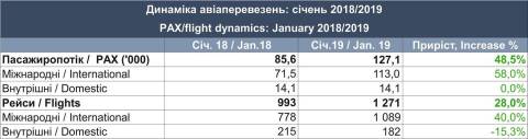 Зокрема, у дописі зазначається, що у січні 2019 р. авіаперевезеннями скористалися 127,1 тис. пасажирів, що на 48,5% більше, ніж у січні 2018 р. (85,6 тис. пасажирів)