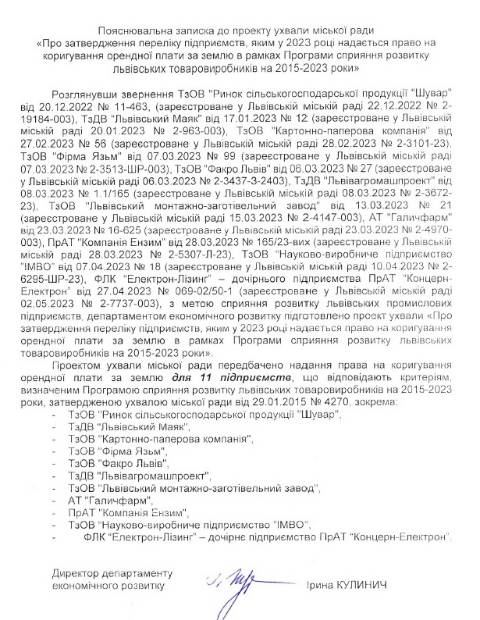 За словами директорки департаменту економічного розвитку Ірини Кулинич, на цих підприємствах працює велика кількість осіб і вони мають великі земельні ділянки. Цьогоріч до цього переліку додали ТзОВ "Науково-виробниче підприємство "ІМВО" та ДП ПрАТ "Концерн-Електрон".