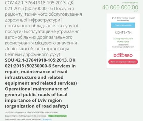 Департамент дорожнього господарства, транспорту та зв’язку Львівської обласної державної адміністрації оголосив тендер у системі ProZorro на експлуатаційне утримання автомобільних доріг загального користування місцевого значення Львівської області (організація безпеки дорожнього руху), що переможець тендеру має постачати до 31 грудня 2019 року.