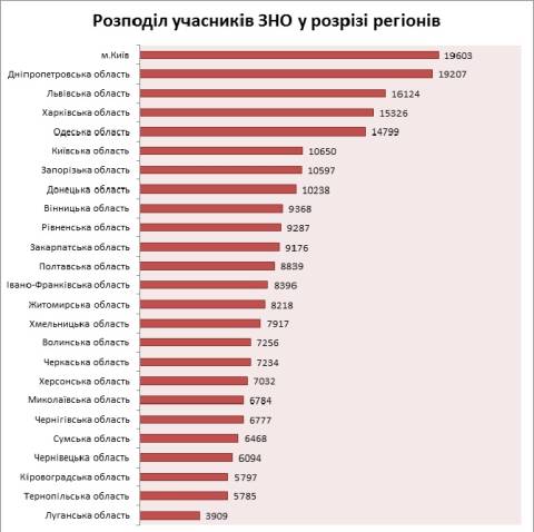 Найбільше учасників проходження ЗНО було зареєстровано в Києві – 19 603, Дніпропетровській області – 19 207, Львівській області – 16 124 особи, Харківській області – 15 326, Одеській області – 14 799, найменше – у Тернопільській – 5 785, Луганській – 3 909 областях.