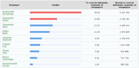 За даними Центральної виборчої комісії, станом на 19:20 год опрацювали 91,38% виборчих бюлетенів. Лідирує кандидат від партії "Слуга народу", шоумен Володимир Зеленський із 30,26% голосів – за нього проголосували 5 167 342 виборців.