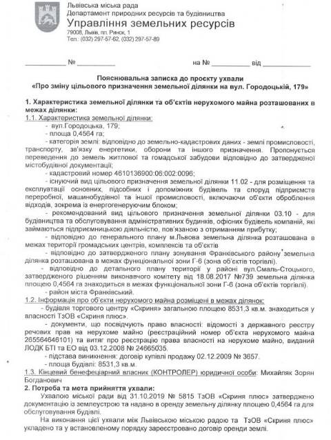 Згідно з документом, йдеться про земельну ділянку площею 0,4564 га на вул. Городоцькій, 179 у Франківському районі Львова, що перебуває у комунальній власності Львова. На цій ділянці знаходиться торговий центр "Скриня" площею 8 531,3 м², що з 2009 року є у приватній власності львівської фірми ТзОВ "Скриня Плюс". Фірма орендує у міськради цю земельну ділянку за 744,27 тис. грн в рік.