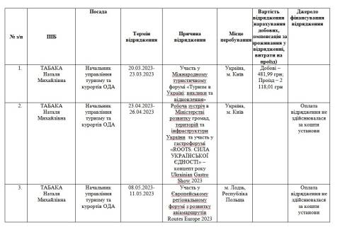 Починаючи з 1 січня й до 31 грудня 2023 року у службових відрядженнях побували начальниця управління туризму та курортів Львівської ОВА Наталя Табака та її заступник Тарас Лозинський.