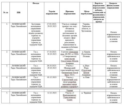 Натомість заступник начальника управління туризму та курортів Львівської ОВА Тарас Лозинський торік побував у 5 відрядженнях у Києві, Чернівцях, Трускавці, Польщі та США, проте вони не фінансувались з бюджету Львівщини: