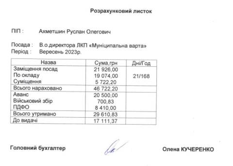 У вересні в.о. директора ЛКП "Муніципальна варта" Руслану Ахметшину нарахували 46 тисяч гривень та