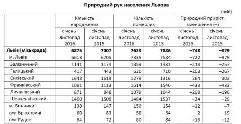 Природне скорочення населення Львова у січні-листопаді 2016 року становило 748 осіб. Натомість у січні-листопаді 2015 року ця цифра скалдала 879 осіб.