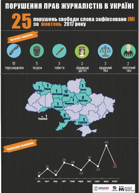 Згідно з результатами щомісячного моніторингу Інституту масової інформації "Барометр свободи слова", у жовтні цього року було зафіксовано 25 випадків порушень прав журналістів і свободи слова.