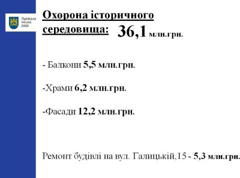 З цих коштів близько 36,1 млн грн отримає управління історичного середовища міськради на реставрацію і ремонт балконів, храмів, фасадів пам’яток архітектури.