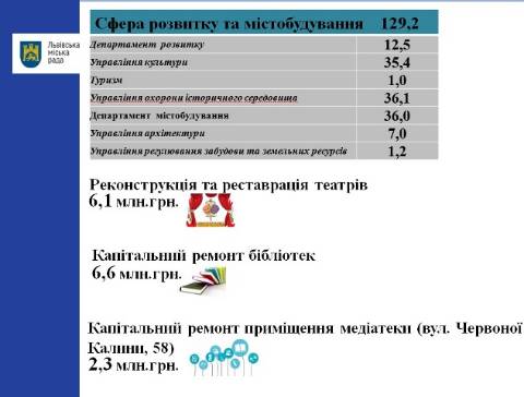 З цих коштів близько 6 млн грн передбачено на реконструкцію і реставрацію театрів у місті, ще 6 млн грн – на ремонт бібліотек, на капітальний ремонт приміщення медіатеки на проспекті Червоної Калини – 2,3 млн грн.