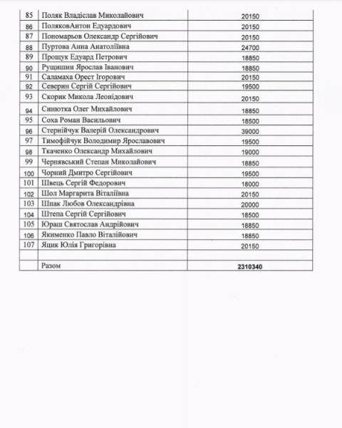 Щодо народних депутатів, які пройшли у Верховну Раду від Львівщини, то компенсацію за житло отримали: Павло Бакунець (позафракційний) – 15 000 грн (не претендував на виплати у листопаді 2019 року), Тарас Батенко (За майбутнє) – 20 150 грн (не претендував на виплати у листопаді 2019 року), Михайло Бондар (Європейська Солідарність) – 20 150 грн (не претендував на виплати у листопаді 2019 року), Галина Васильченко (Голос) – 39 000 грн, Микола Величкович (Європейська Солідарність) – 20 150 грн, Юрій Камельчук (Слуга народу) – 20 150 грн, Роман Лозинський (Голос) – 20 150 грн, Євген Петруняк (Слуга народу) – 18 000 грн, Наталія Піпа (Голос) – 39 000 грн (у грудні 2109 року їй виплатили за житло у Києві 39 650 грн, а у січні-лютому її у цьому списку не було), Ярослав Рущишин (Голос) – 18 850 грн, Орест Саламаха (Слуга народу) – 20 150 грн, Олег Синютка (Європейська Солідарність) – 18 850 грн, Святослав Юраш (Слуга народу) – 18 850 грн.
