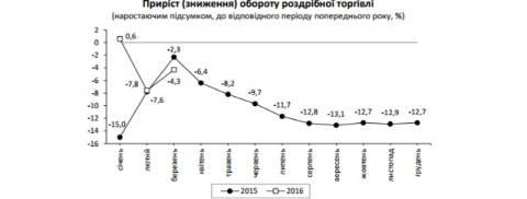 Нагадаємо, у лютому цього року торгівля у роздріб склала 8305,4 млн грн, що на 7,6% більше, ніж у лютому 2015 року.