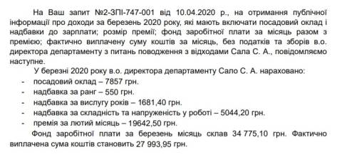 Із цих коштів Сало сплатив 6 781,15 грн податку з доходів фізичних осіб та військового збору. Відтак, фактично виплачена заробітна плата Сергію Салу за березень цього року без податків, зборів та перерахувань становила 27 993,95 грн.