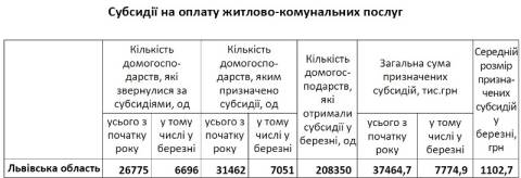 У березні субсидії на оплату житлово-комунальних послуг отримали 208,4 тисяч домогосподарств.