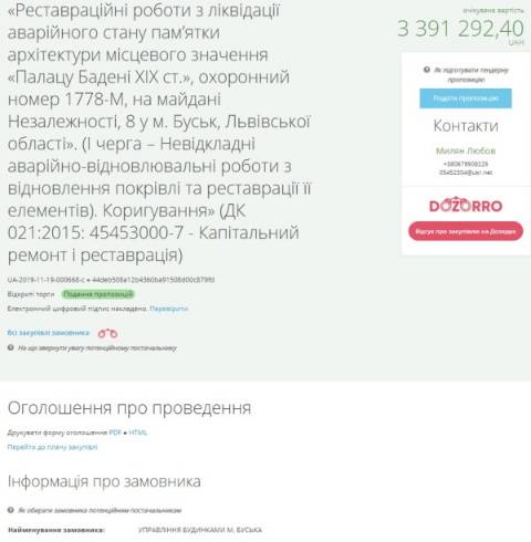 Управління будинками Буська оголосило тендер у системі ProZorro на першу чергу реставраційних робіт з ліквідації аварійного стану Палацу Бадені ХІХ ст., яку переможець тендеру має здійснити до 31 грудня 2020 року.
