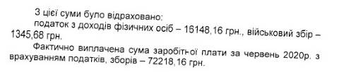 Із цих коштів Маруняк сплатила 16 148,16 грн податку з доходів фізичних осіб та 1 345,68 грн військового збору. Відтак, фактично виплачена заробітна плата чиновниці за червень цього року без податків, зборів та перерахувань становила 72 218,16 грн. Додамо, у січні Маруняк нарахували 154 тис грн зарплати, у лютому – 90 тис грн, у березні – 93 тис грн, у квітні – 98 тис грн, у травні – 84 тис грн.