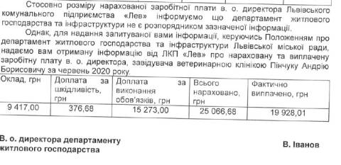 У червні цього року виконуючому обов'язки директора ЛКП "Лев" Андрію Пінчуку нарахували 25 066,68 грн заробітної плати. Зокрема, у цю суму увійшли такі виплати:
