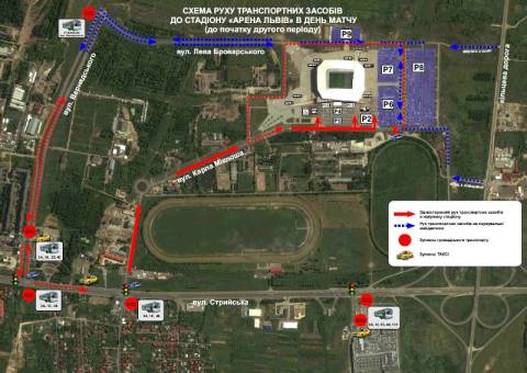 Виїзд зі стадіону після матчу відбуватиметься за маршрутами: "Арена Львів" – Л. Броварського – Вернадського – Стрийська.