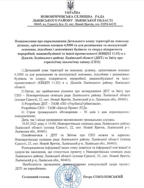 Новояричівська селищна рада Львівського району замовила звіт про стратегічну екологічну оцінку детального плану території у селі Дідилів Львівського району.