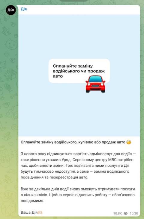 "Із нового року підвищується вартість адмінпослуг для водіїв – таке рішення ухвалив уряд. Сервісному центру МВС потрібен час, щоби внести зміни. Тож пов’язані з ними послуги в "Дії" будуть тимчасово недоступні, а саме – заміна водійського посвідчення та перереєстрація авто" – йдеться у повідомленні.