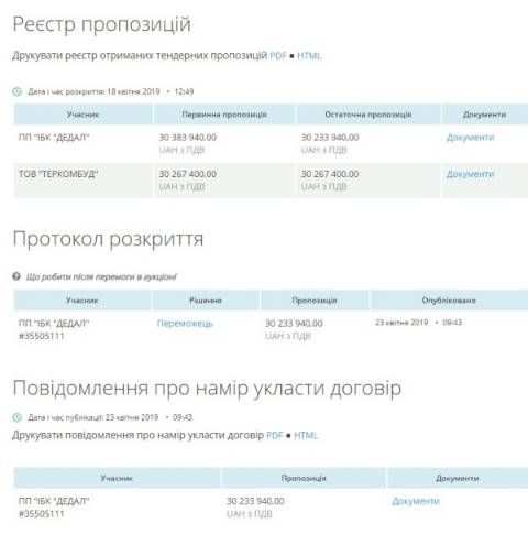 Аукціон стартував 18 квітня, участь у ньому взяли ПП "ІБК "Дедал" та ТОВ "Теркомбуд", які запропонували за свою роботу 30 233 940 грн і 30 267 400 грн відновідно. переможцем обрали ПП "ІБК "Дедал", а очікувана вартість послуг становила 32 829 494,40 грн.