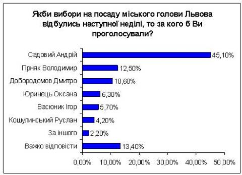 Якби вибори відбулись найближчої неділі, то 44% респондентів проголосували б за чинного мера, друге місце – у Володимира Гірняка.
