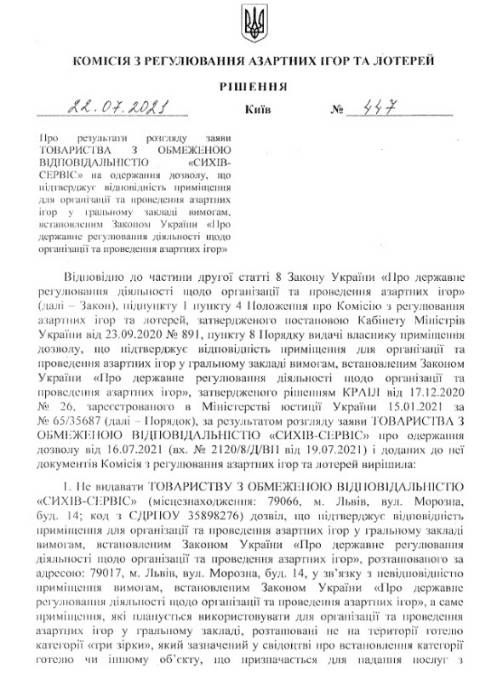 Натомість комісія відмовила у облаштуванні гральних автоматів у ТзОВ "Сихів-Сервіс", що знаходиться на вул. Морозна, 14. Як йдеться у рішенні, приміщення, де тризірковий готель "Сихів-Сервіс" планує розмістити зал гральних автоматів, не відповідає вимогам закону щодо організації та проведення азартних ігор. Зокрема, воно знаходиться не та території готелю.