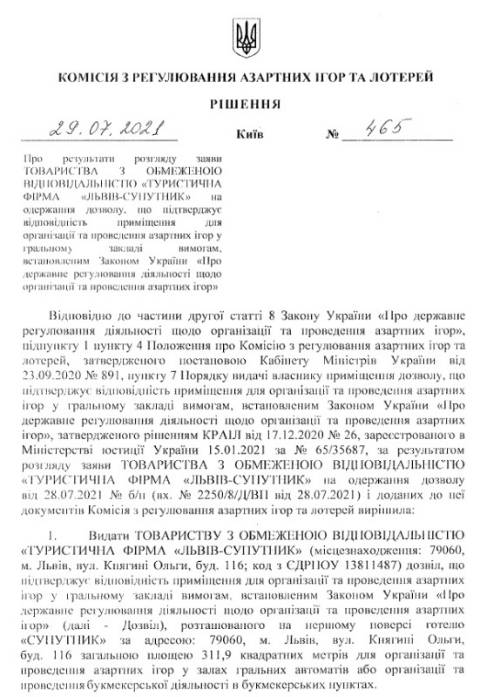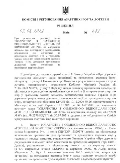 Комісія з регулювання азартних ігор та лотерей дозволила облаштувати зали гральних автоматів у двох львівських готелях: ТзОВ "Готельний комплекс "Жорж" (площа Міцкевича, 1) та у ТзОВ "Туристична фірма "Львів-Супутник" (вул. Княгині Ольги, 116).