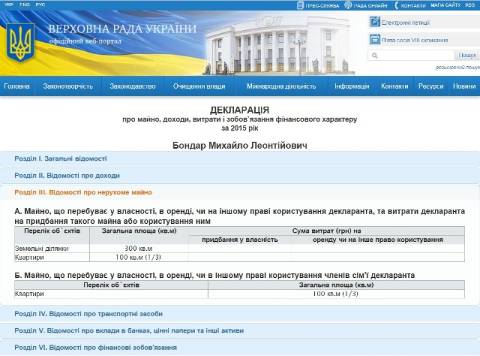 Народний депутат з Львівщини Михайло Бондар заповнив дані у єдиному державному реєстрі декларацій за 2015 рік.