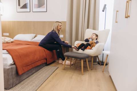 Сімейна кімната займає площу 174 м². У ній облаштовано 5 окремих спальних кімнат із санвузлами, що дозволяють родинам перебувати поруч із дитиною протягом днів або навіть місяців. Простір також оснащено сучасною кухнею для приготування домашньої їжі, душовою кімнатою, пральнею, а також зонами для відпочинку та спільного проведення часу – вітальнею та ігровою.