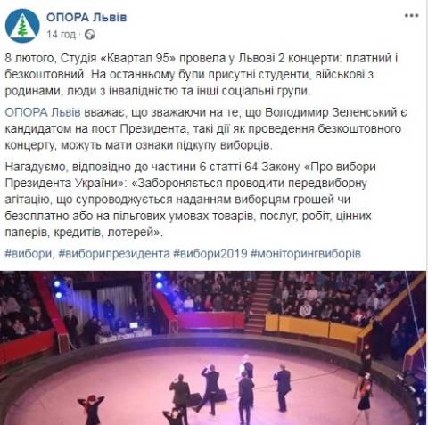 У ГО "Опора Львів" вважають, що безкоштовний концерт може мати ознаки підкупу виборців через те, що Володимир Зеленський є кандидатом на пост Президента України.