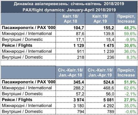 Загалом, за січень-квітень пасажиропотік зріс на 51,9%, в порівнянні з цими місяцями минулого року (345,4 тисяч пасажирів), і досяг позначки в 524,6 тисяч пасажирів.