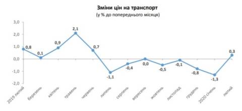 У сфері транспорту у лютому 2020 року, порівняно з попереднім місяцем, ціни підвищилися на 0,3%. Транспортні послуги подорожчали на 1,3%, зокрема, вартість проїзду у міському транспорті – на 9,6%, у міжміському поїзді – на 4,8%. Водночас, вартість перевезень авіаційним пасажирським транспортом зменшилася 4,7%.