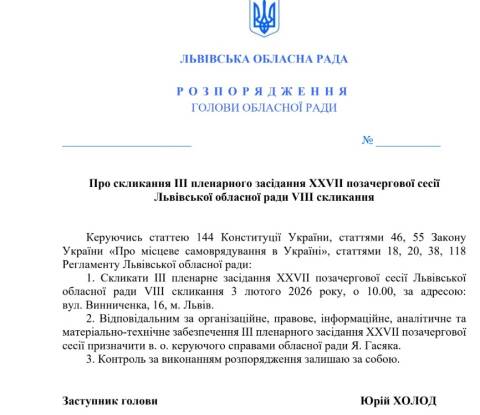 "Скликати III пленарне засідання XXVII позачергової сесії Львівської обласної ради VIII скликання 3 лютого 2026 року, о 10.00, за адресою: вул. В. Винниченка, 16, м. Львів.
