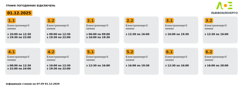 Сьогодні, 1 грудня, на території Львівської області енергетики застосовуватимуть графіки погодинних відключень електроенергії.