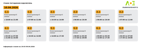 Сьогодні, 10 квітня, на території Львівської області енергетики застосовуватимуть графіки погодинних відключень електроенергії.