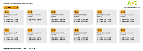 Сьогодні, 12 лютого, на території Львівської області енергетики застосовуватимуть графіки погодинних відключень електроенергії.
