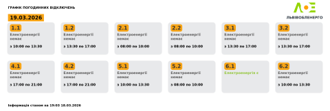 Сьогодні, 19 березня, на території Львівської області енергетики застосовуватимуть графіки погодинних відключень електроенергії.