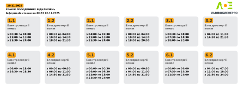 Сьогодні, 20 листопада, на території Львівської області енергетики застосовуватимуть графіки погодинних відключень електроенергії.