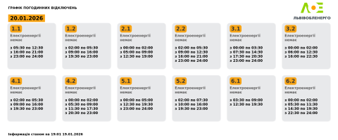 Сьогодні, 20 січня, на території Львівської області енергетики застосовуватимуть графіки погодинних відключень електроенергії.