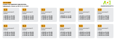 Сьогодні, 21 листопада, на території Львівської області енергетики застосовуватимуть графіки погодинних відключень електроенергії.