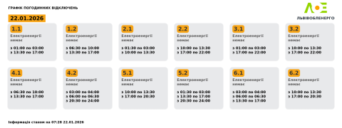 Сьогодні, 22 січня, на території Львівської області енергетики застосовуватимуть графіки погодинних відключень електроенергії.