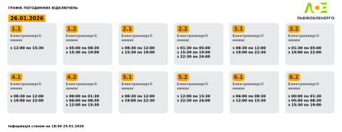 Сьогодні, 26 січня, на території Львівської області енергетики застосовуватимуть графіки погодинних відключень електроенергії.
